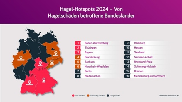 Zu den 2024 von Hagelschäden am stärksten betroffenen Regionen zählten Baden-Württemberg, Thüringen und Bayern. Bei den Großstädten nehmen Duisburg, Leipzig und Stuttgart die Spitzenplätze ein. Das geht aus einer internen Datenanalyse der Hagelschäden hervor, die 2024 von der Verti Versicherung AG (Verti), Deutschlands zweitgrößtem Kfz-Direktversicherer, registriert wurden. Der Hagel-Atlas mit Infografiken und Expertentipps wird jährlich von Verti veröffentlicht und steht als PDF zum Download zur Verfügung.
